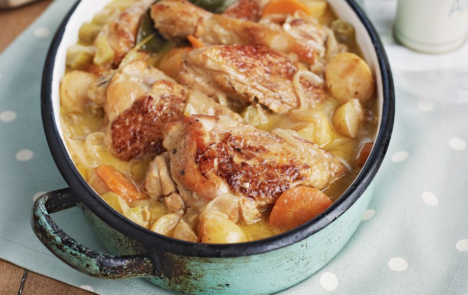 In a large cast-iron casserole or frying pan, heat a little oil and brown the chicken pieces all over, then transfer to a plate (you may need to do this in batches). Brown the bacon and put on the plate with the chicken. Add a knob of butter to the oil in the casserole and gently brown the onions and mushrooms, before adding the chicken and bacon back into the casserole.