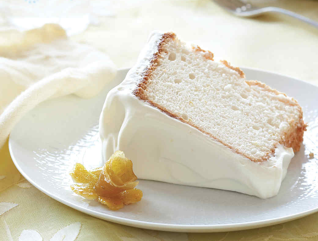 3. Bake for approximately 1 hour until cake is pale creamy brown color and top springs back when gently touched with finger and/or a wooden skewer comes out clean. Cool cake upside down in pan.